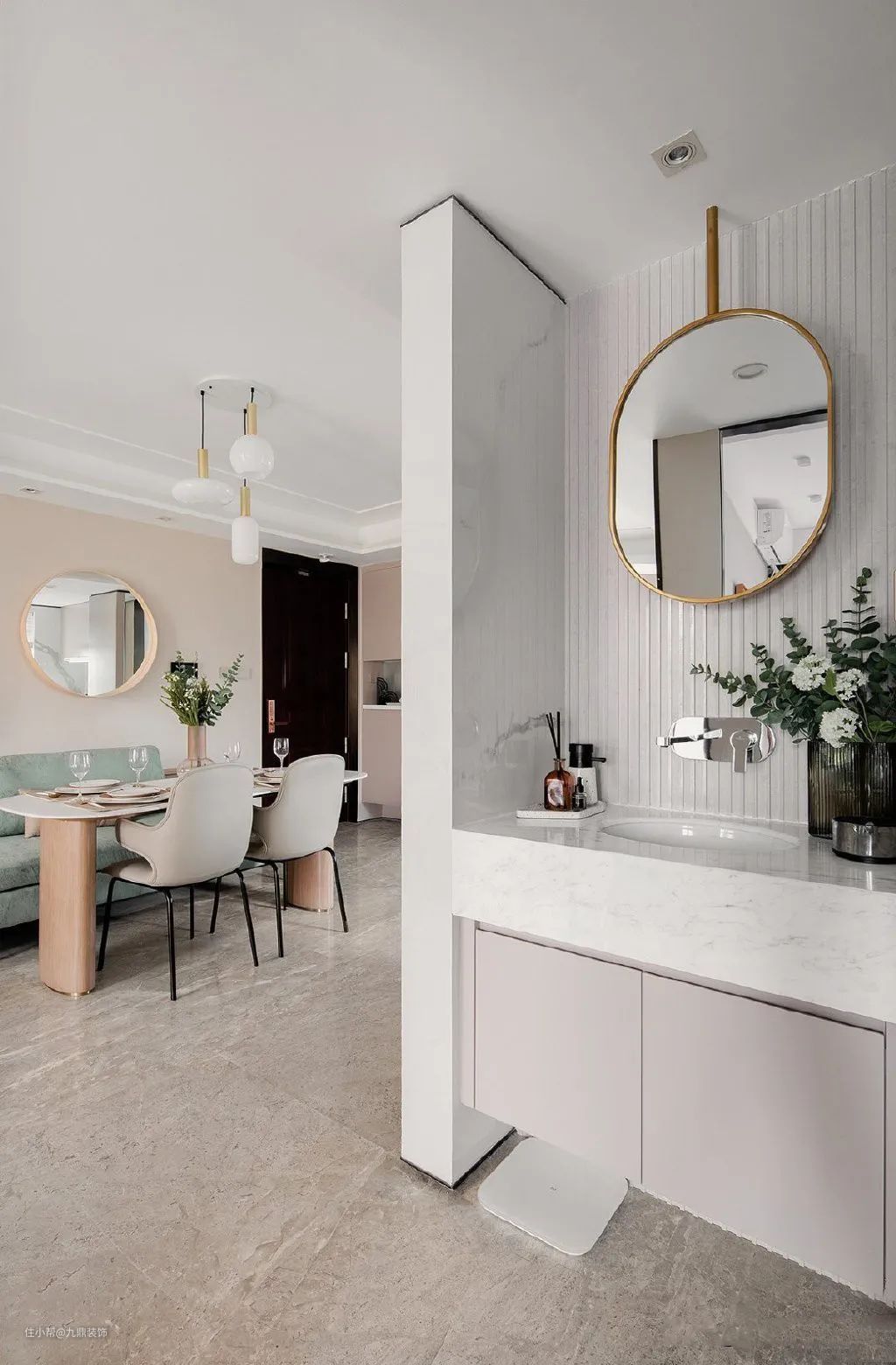 从卧室区正好可以看到过道上的洗手台,浅粉色的饰面板与同样色系的浴室柜相搭,再配上金属边框的化妆镜,显得精致极了。