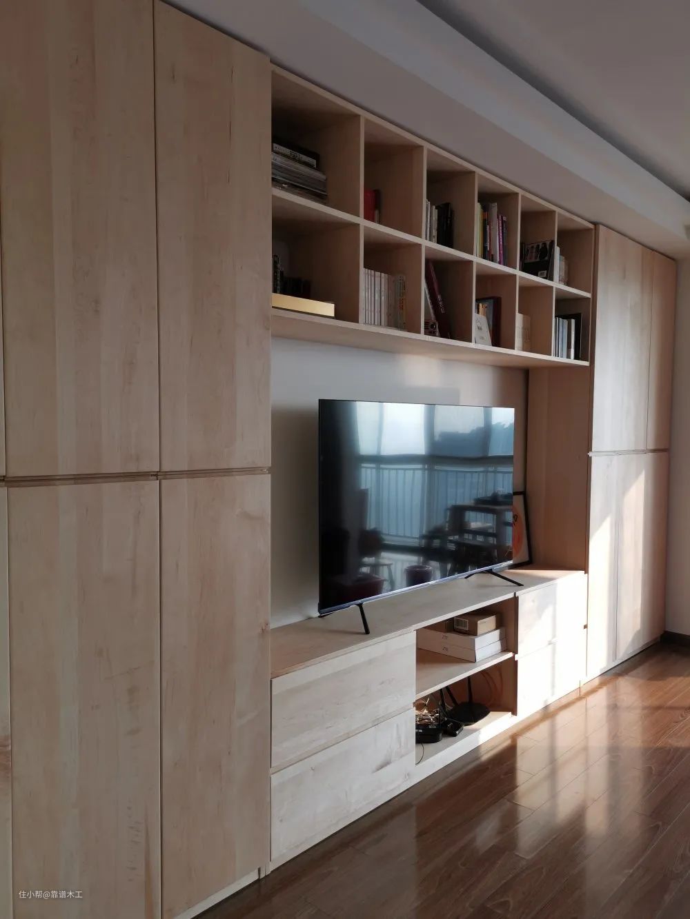 靠谱木工客户实拍:硬枫木满墙电视柜