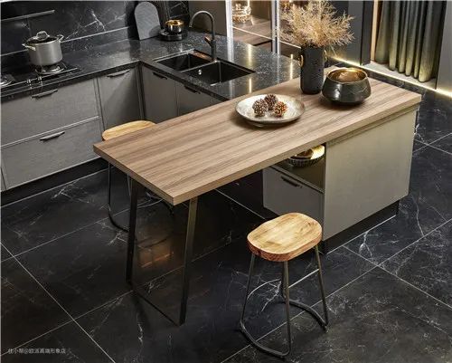 同时,在橱柜旁边设置一个简易的小吧台,不仅会让厨房空间多了一个小资情调的地方,让厨房生活变得更加精致,还能给厨房划分出一个全新的功能区,完成日常传菜、吃饭等活动,还能分担厨房的部分收纳功能。
