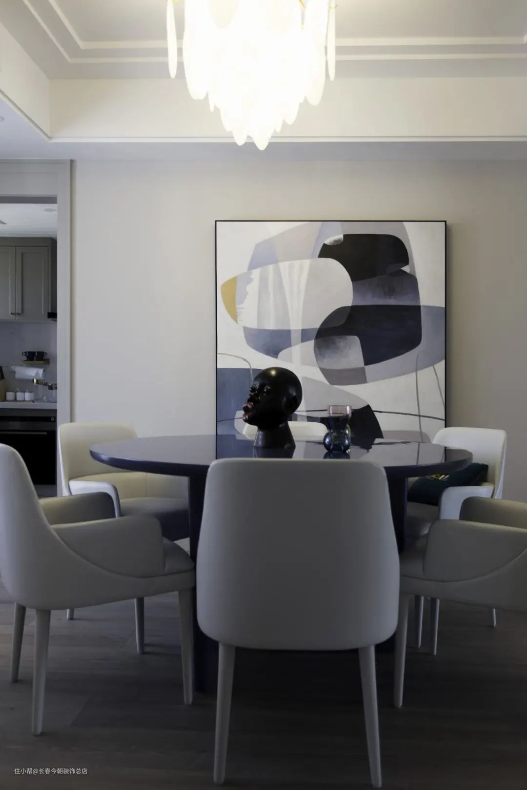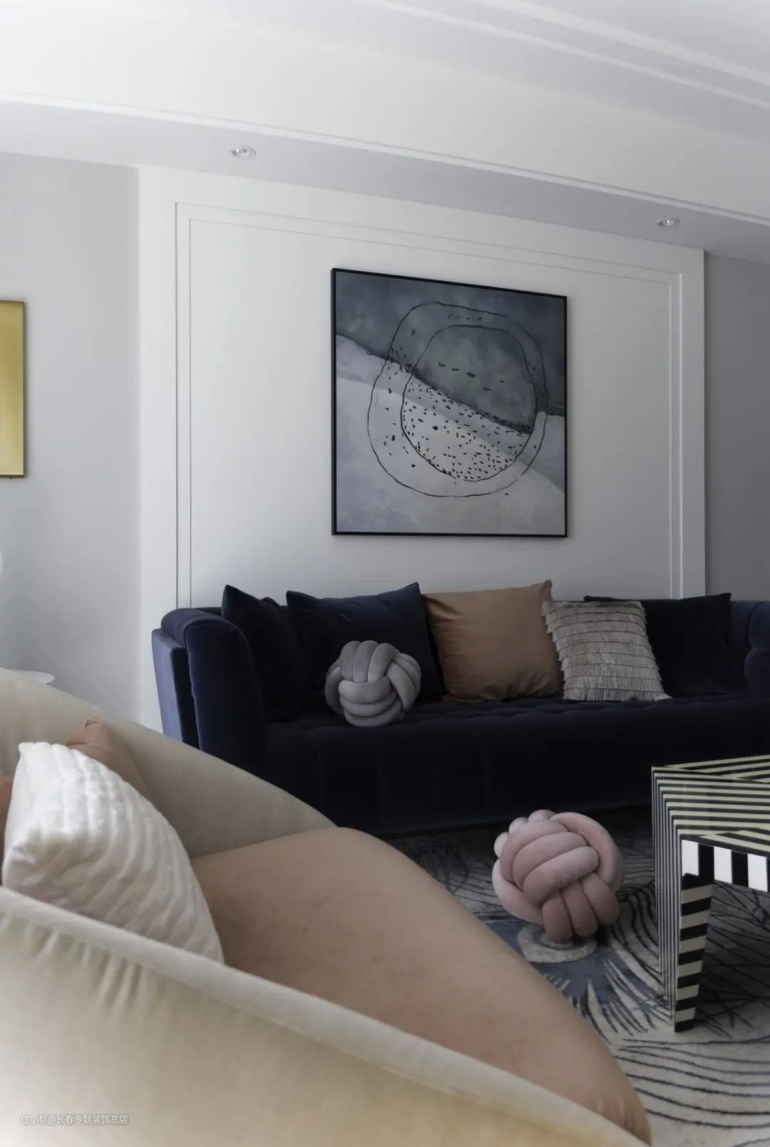 ▲在灰色的沙发墙基础,中间区域装一块白色护墙板,挂一幅抽象派的装饰画,搭配深蓝色的布艺沙发,给人以成熟优雅的端庄感。