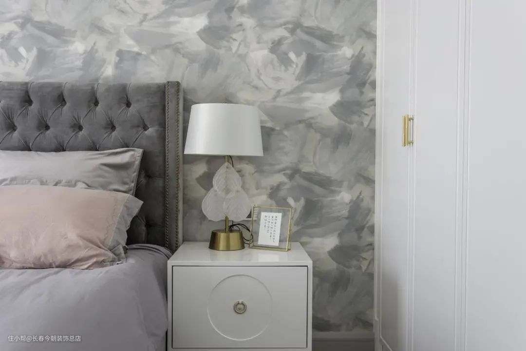 ▲床头墙上贴着灰色涂鸦抽象的墙布,布置银灰色布艺靠背床,带来的空间效果也更加温雅而端庄。