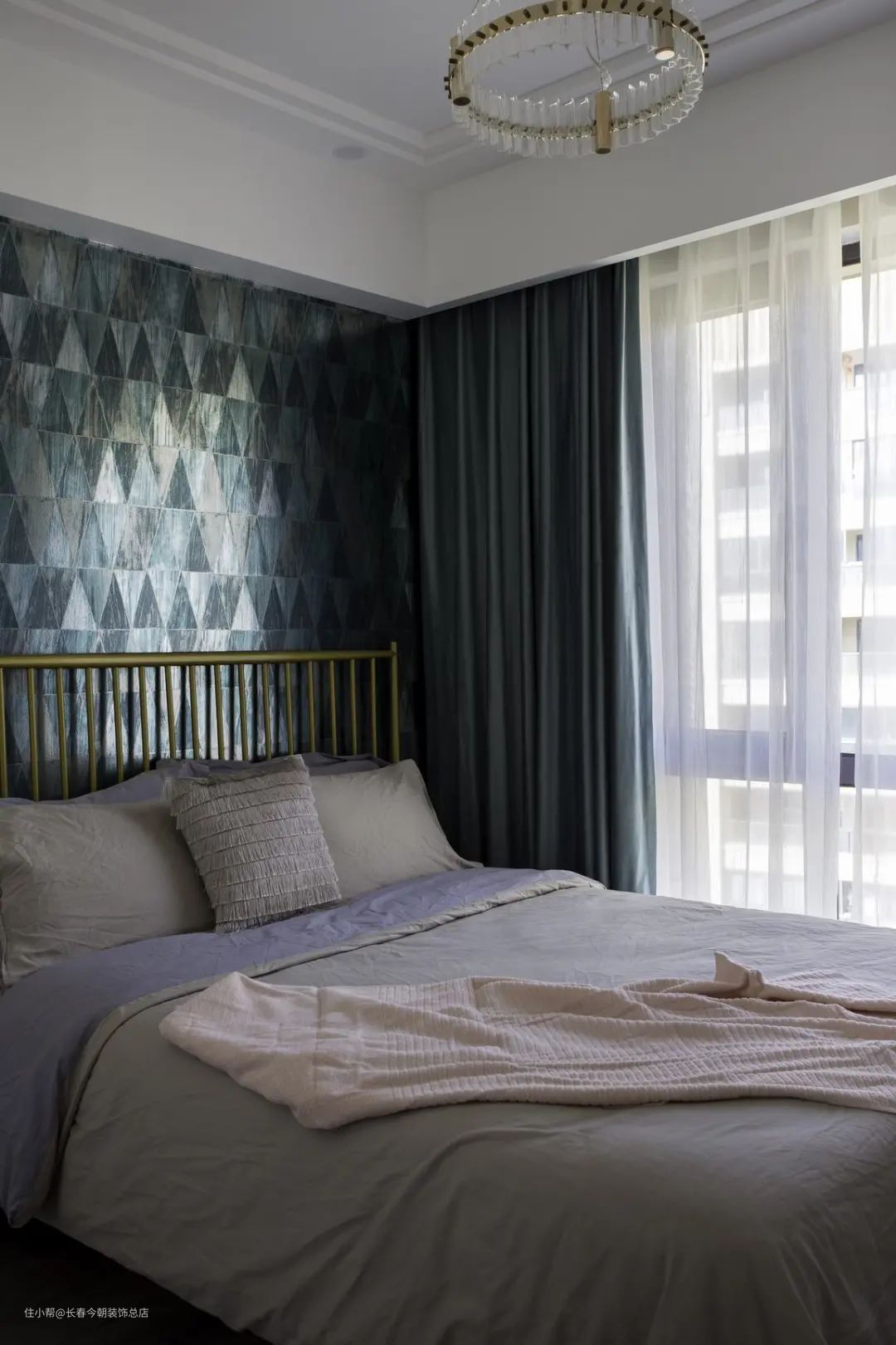 ▲次卧的床铺背景墙贴上复古调的绿色三角拼接图案,摆上金色的铁艺床,还有粉色与紫色的床单布置,也让空间显得更加优雅浪漫而情趣。
