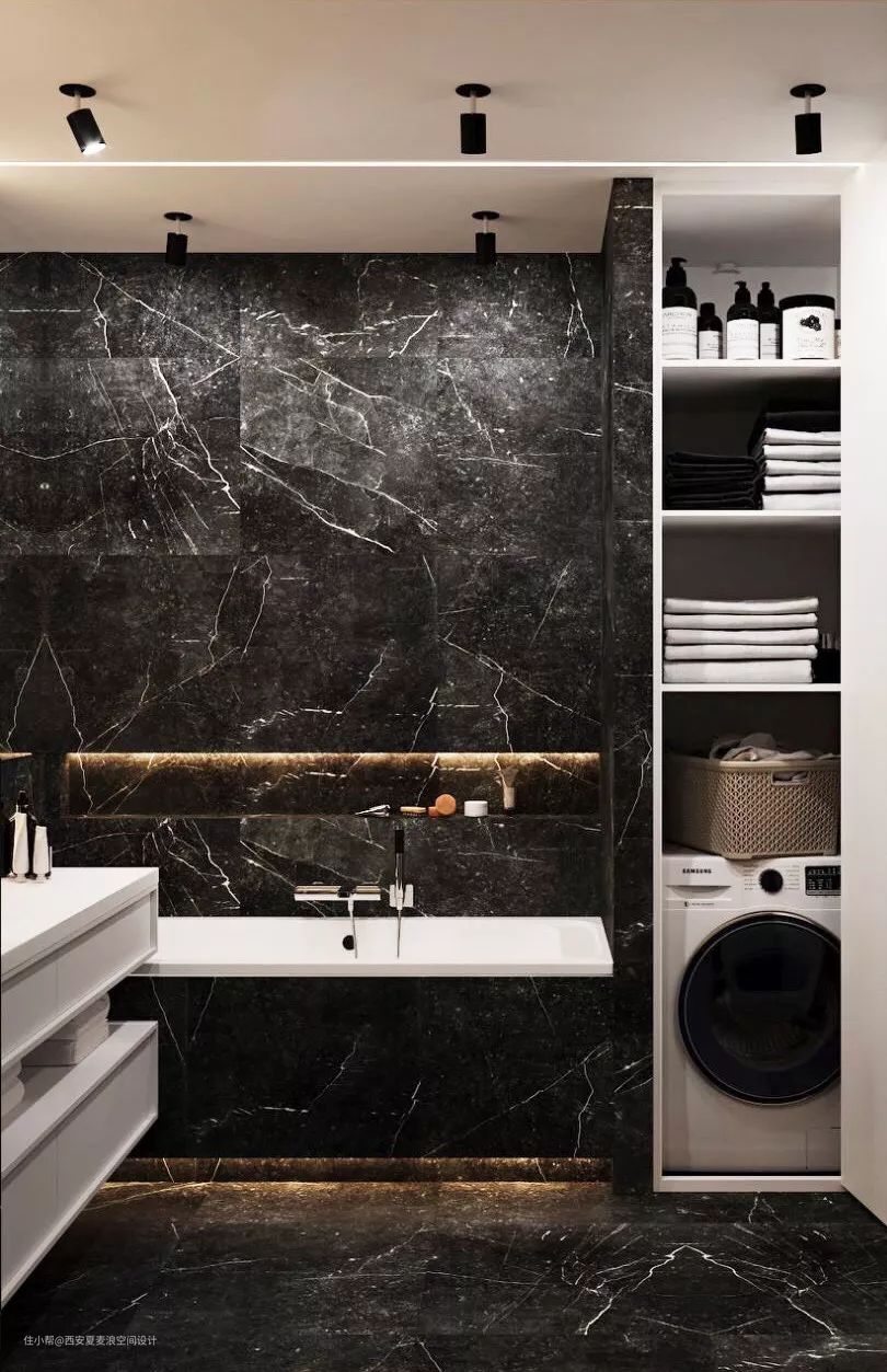 卫生间管道多,用常规方法完全包起来太浪费了。可以利用不规则空间在包管时设计壁龛,既能完美隐藏各类管道,不占空间面积,还实用美观。