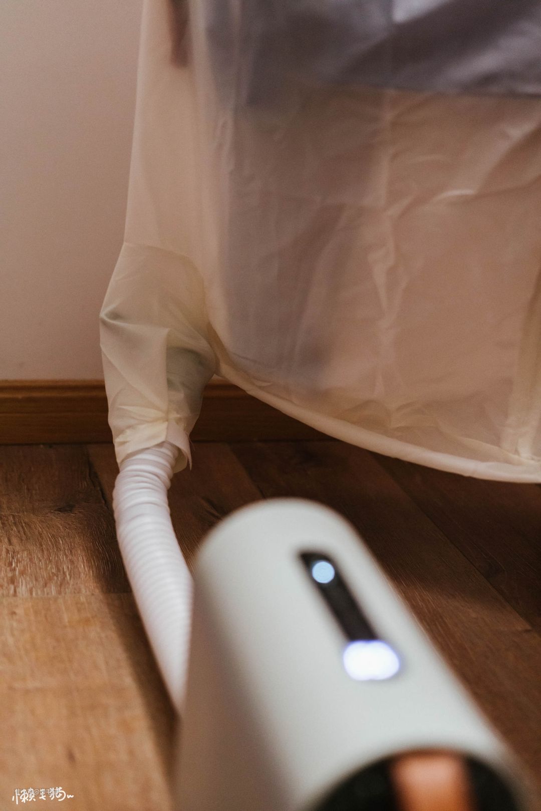伸缩软管可以收纳在机身里,但是拉开后长度可达半米,并且可以根据需求弯折并固定,搭配干衣袋,可以快速烘干,告别湿冷衣物。