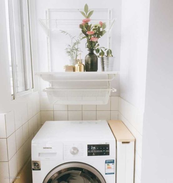 阳台没有做储物柜,直接放个洗衣机,就没有可以收纳的地方。可以在洗衣机上方安装艾格特衣架,用来放脏衣服以及小绿植等,轻松就能把垂直空间利用起来。