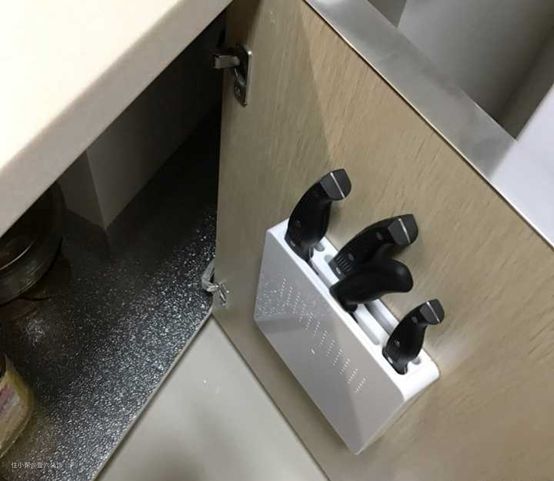 家里刀具较多,放台面上占地方又有点危险,通过一个壁挂的刀具架,就可以壁挂在操作台下的柜门上。