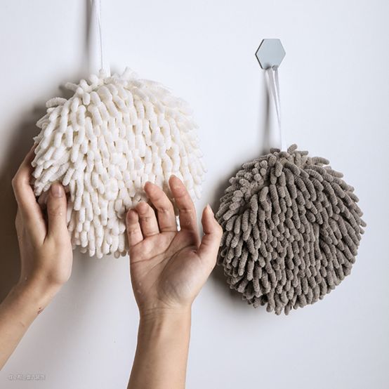 擦手球本身圆形造型,也十分可爱,挂在卫生间洗漱区,亲肤的手感,也会让你爱上擦手。