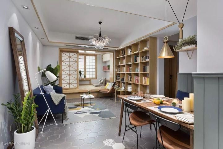 ▲ 客厅和餐厅之间,用一部分空间做了地台,解决了书房、休闲区、卡座等多种功能,小面积的多重利用