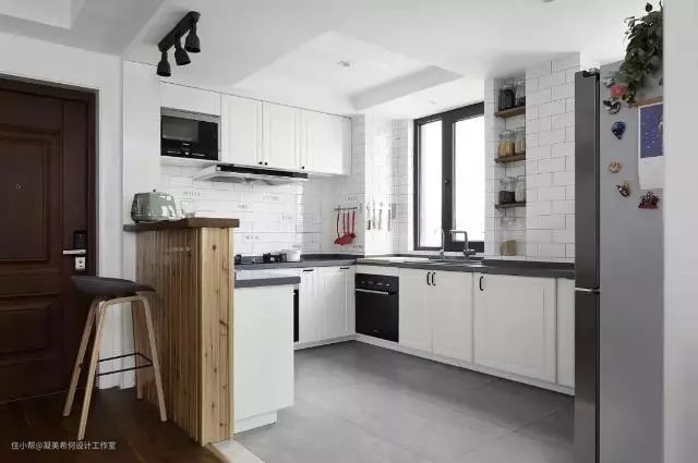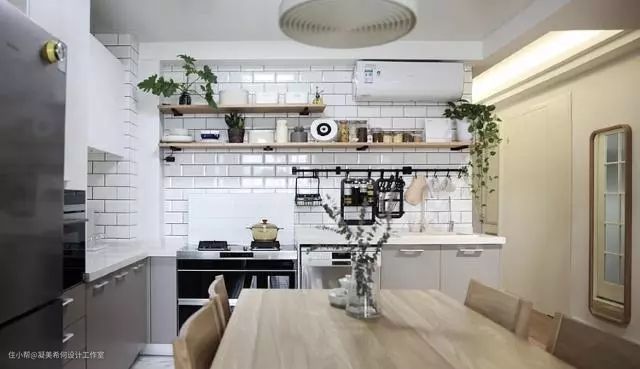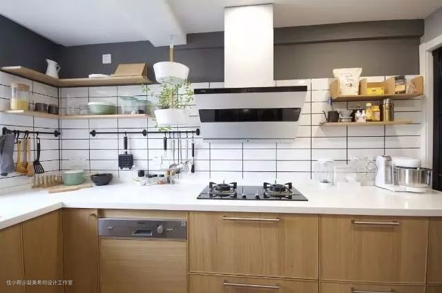 ▲小白砖加置物板收纳,开放式方法配备集成灶,整体棒棒哒!