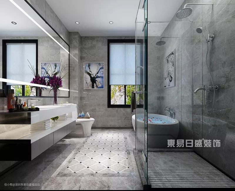 建议选择尺寸较小的卫浴产品,多增添收纳空间,做好干湿分区。另外选用浅色的瓷砖提高空间明度可以使卫生间看上去视觉上显大一点。暗卫的话可以安装大吸力的排风系统。