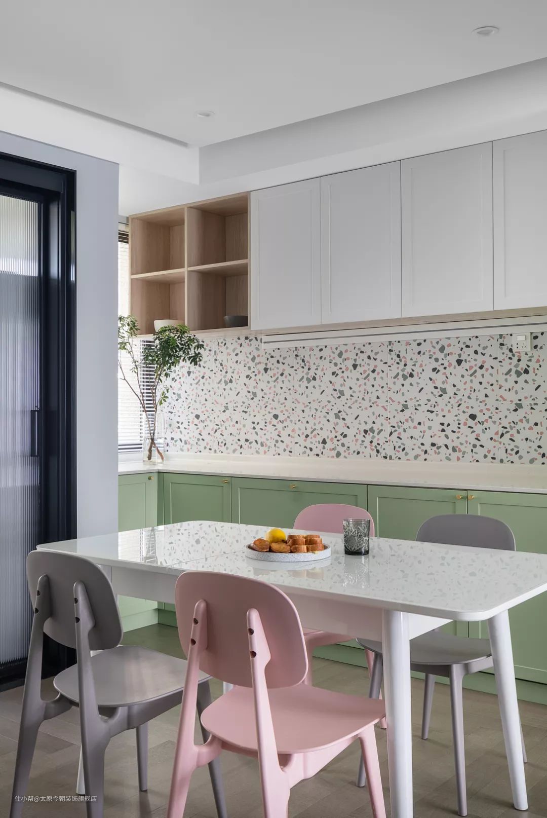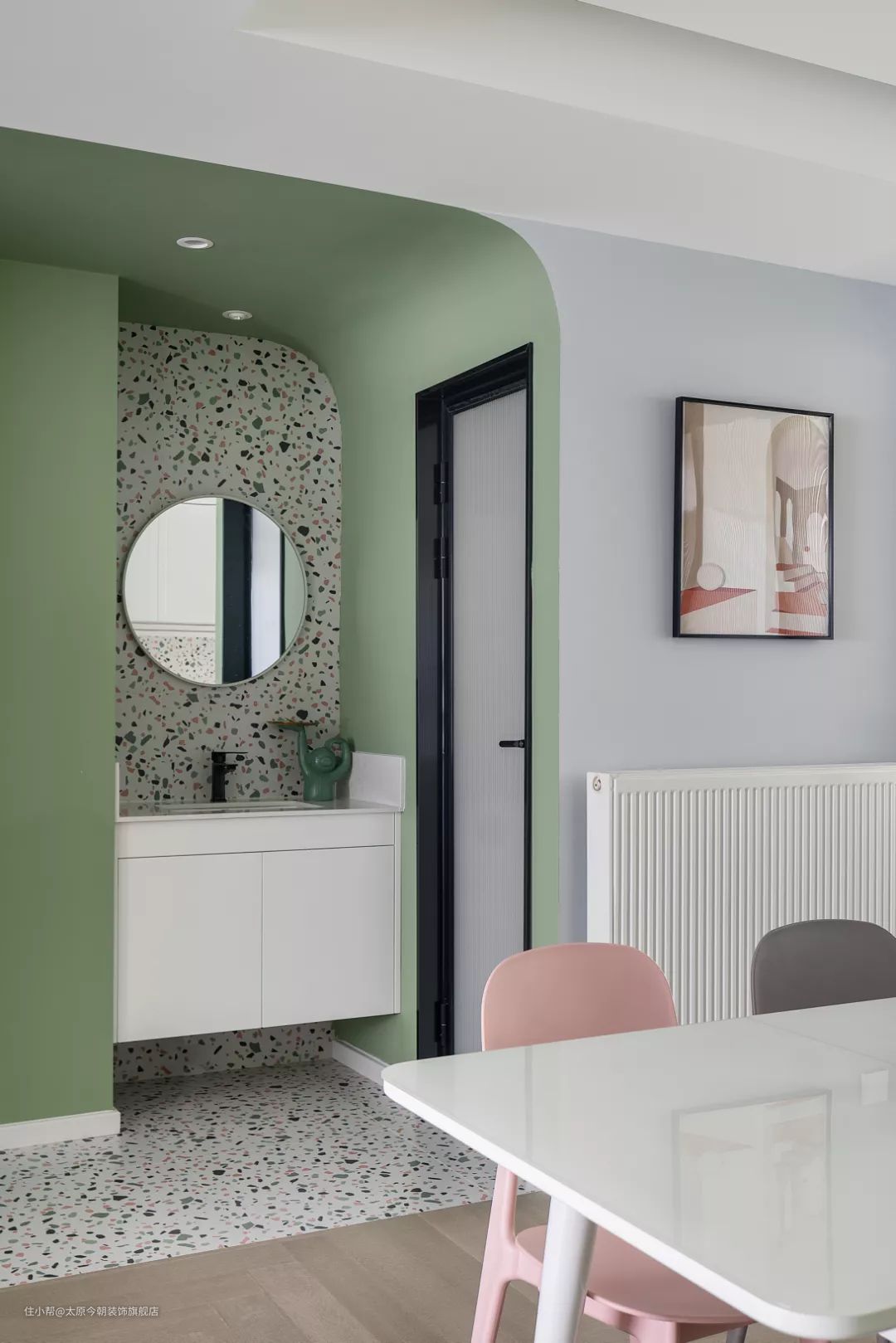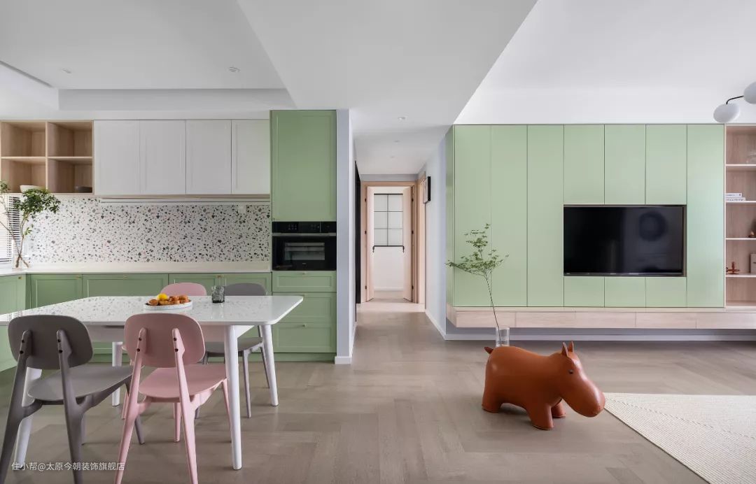 110㎡婚房装修,牛油果绿+水磨石元素,太甜了!