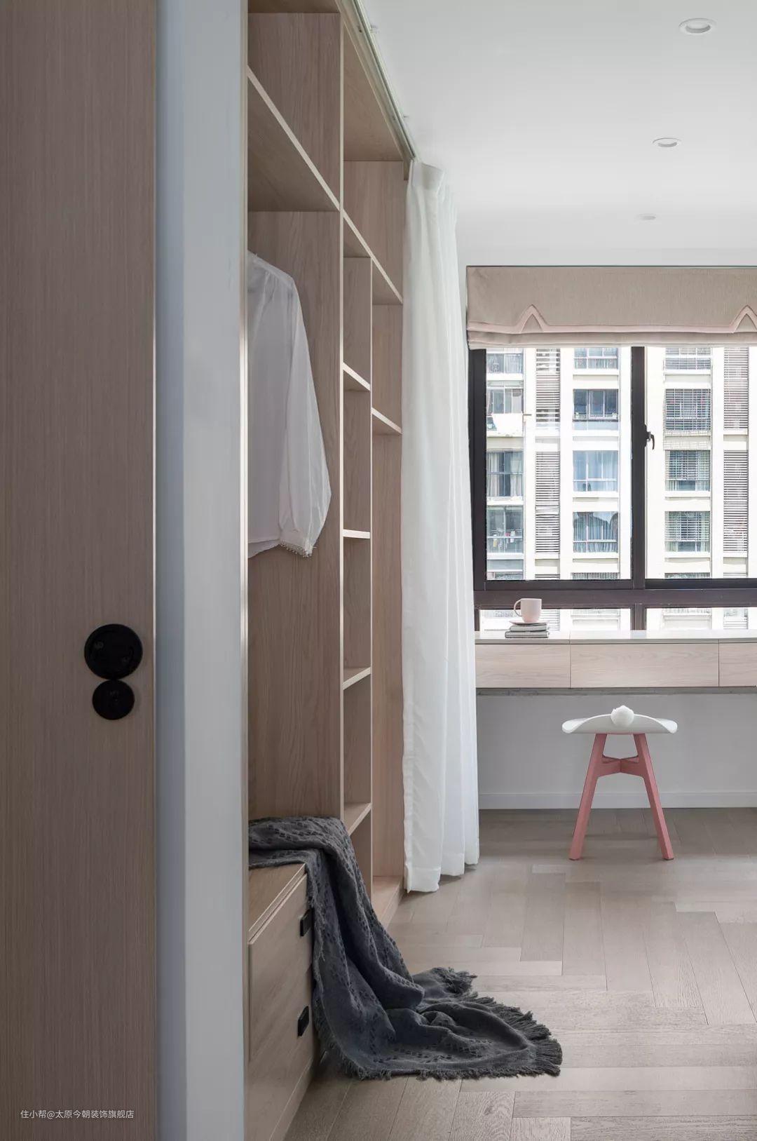 衣帽间采用帘子和量身定制的收纳系统结合,一目了然方便穿搭,拉上帘子又能避免杂乱落灰。