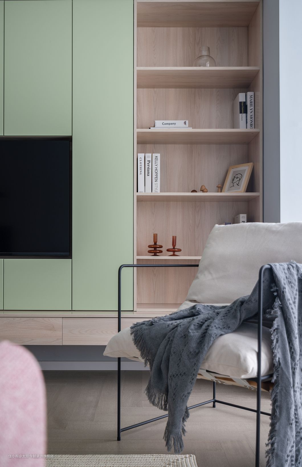 靠近阳台一侧设计了开放柜格,展示常看的书籍、装饰品,方便拿取也能打破单调沉闷。
