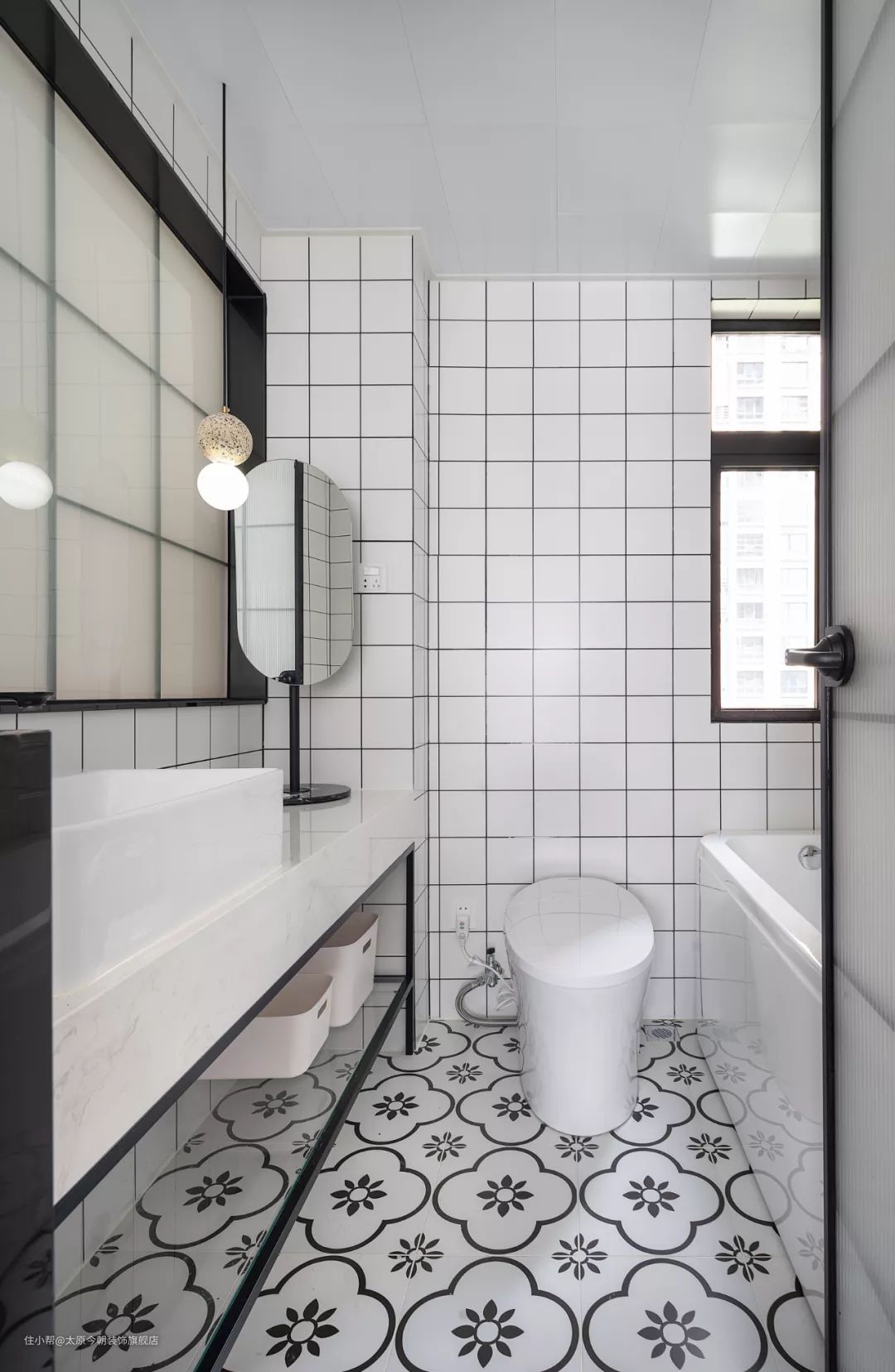 主卫地面铺小花砖避免单调,洗手台面足够宽敞,可以兼做梳妆使用,还布置了浴缸,方便泡澡放松。