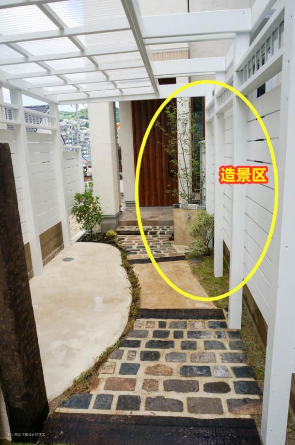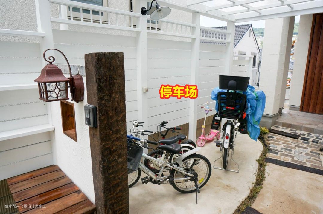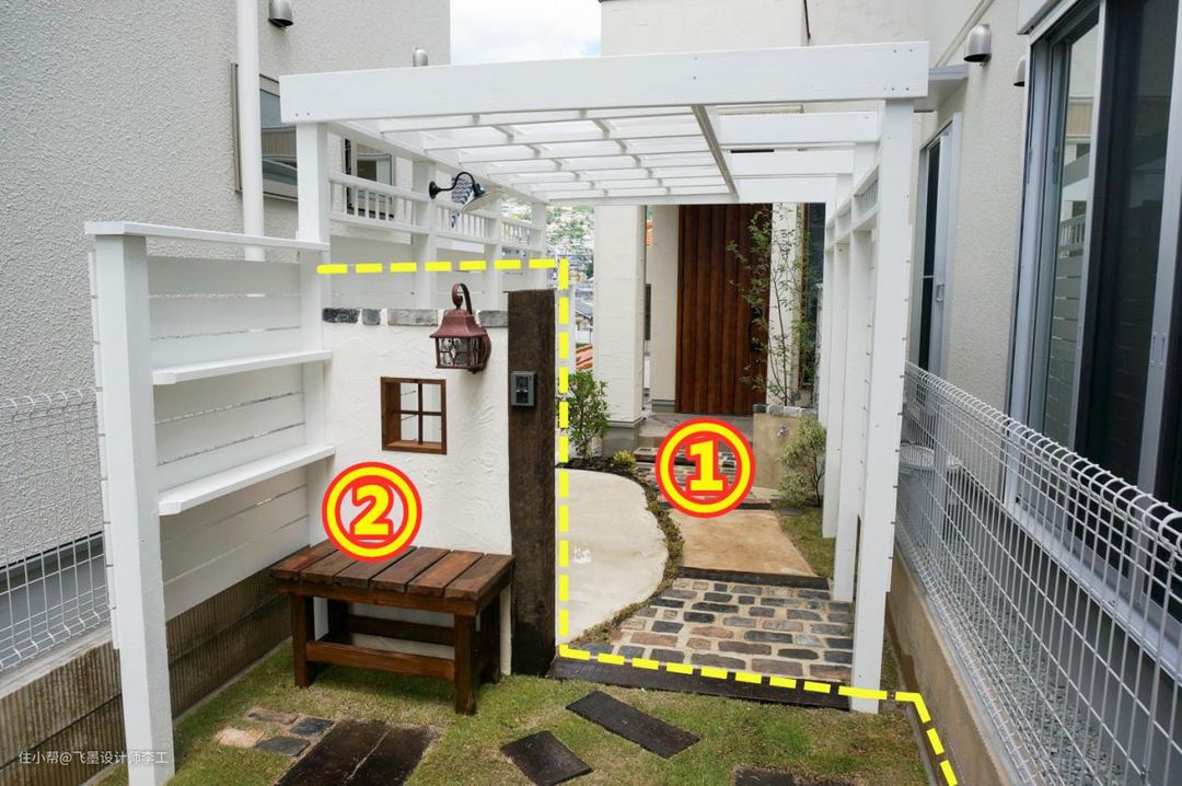 这位博主家实现"二分离"布局,将入户门外一分为二。其中最重要的一半就是入户造景区,顶面有廊架,遮阳、遮雨都有一定优势!这里也被日本博主分为2部分,一部分现浇水泥地,埋有地漏,作为自行车或玩具车的停车场,或是在这里冲洗它们都可以,很方便。