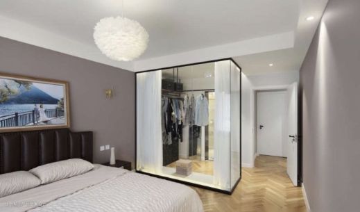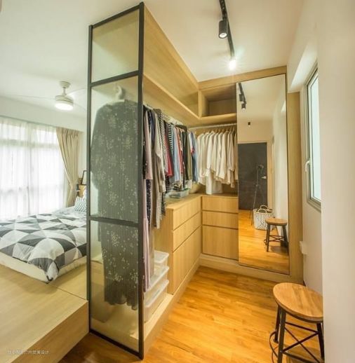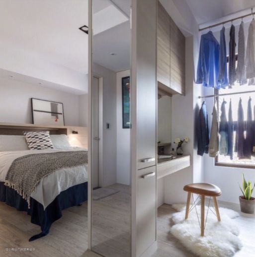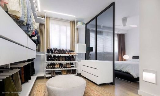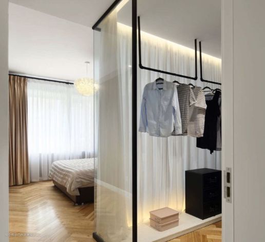 还有一种比较节省空间的办法,就是用玻璃隔断隔出衣帽间,不用打柜子,衣架直接吊在天花板上,底下可以定制格架或抽屉柜。