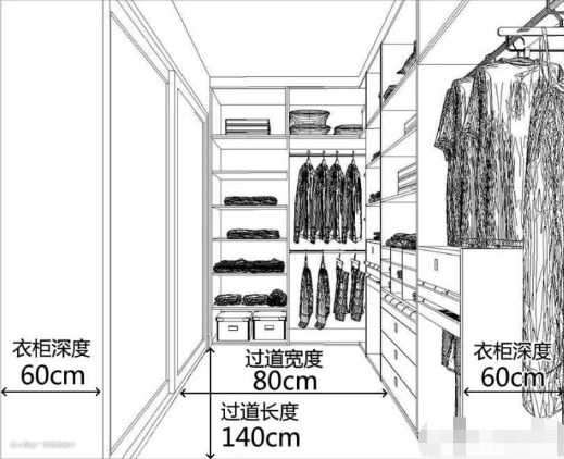 如果柜深按60cm算,过道至少也得60cm才能保证一个舒适的步入空间,所以宽度不能小于120CM,如果按2.5米长来算,那至少需要3㎡左右的空间