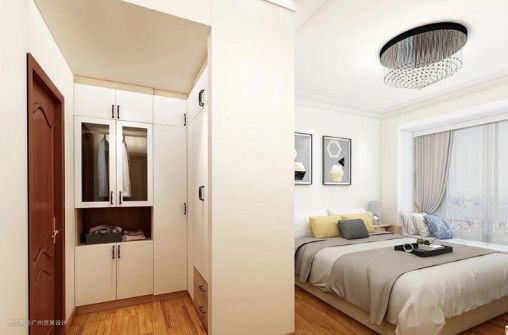 这种方法比较适合那种比较宽敞的卧室,不用施工打隔断,两个柜子拐角组成一个开放式衣帽间,也很实用。