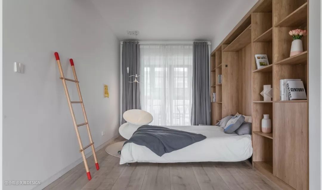 像这种利用飘窗,设计出可活动抽拉的「排骨架」也是非常罕见的,应该是设计师的瞬间灵感。平时两个排骨架穿插在一起相当于只占半张床的长度,可以当普通飘窗座榻使用。必要的时候抽出来变成床架,垫上棉被褥子就能当临时卧室了。这种奇妙点子,是否对你家新房设计装修有帮助呢?