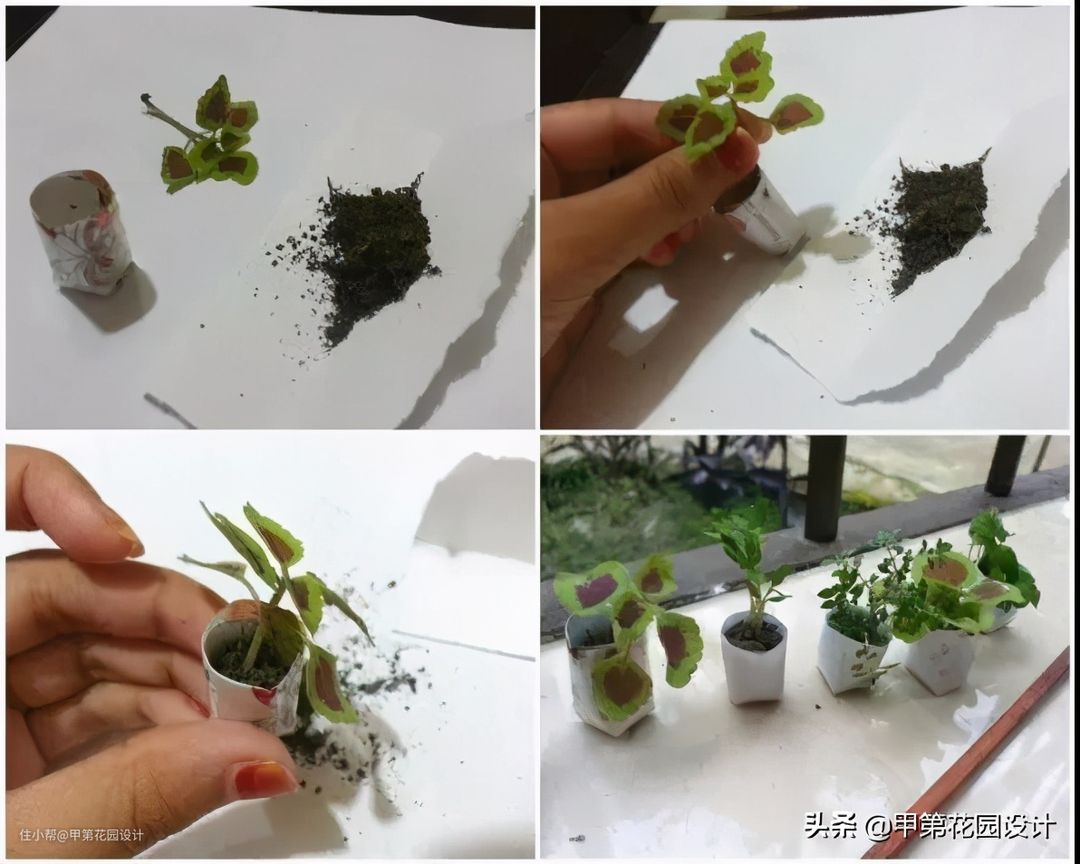 第4步:用纸张(想种长久点的可用塑料或别的材料哦)做成各种形状的小花盆,放入少量碎土并栽上带根的小棵植物。