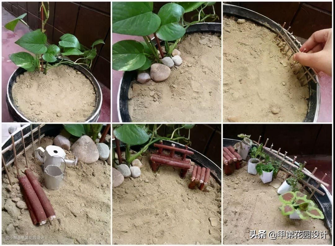 第11步:准备一口不大的小水缸或其他瓷器石头容器均可,装满土,整平。再用绿萝或家里有其他植物的种植在容器内,捡些河卵石塞在植物根部位置。其他的将之前做好的小物品,按你喜欢的方式放置在花盆里吧。
