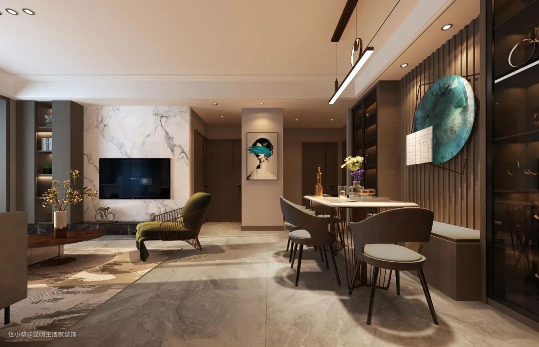 餐厅与客厅相连,整体造型保持一致。现代极简的大理石台面长桌,一侧餐椅改为卡座,合理的利用空间,两侧做了满墙的L型棕色收纳柜,内置灯带+咖色玻璃的设计,中间在搭配一个湖蓝色+白色的几何拼接装饰,提升了空间的装饰效果,又具有趣味性。