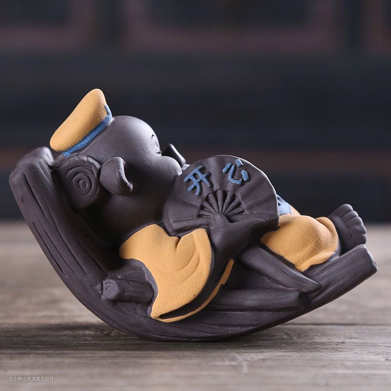 喜欢品茶之人,茶桌上一定都少不了它,偌大一张大茶桌或茶盘上,除了有茶杯、壶等茶具之外,少不了要摆放了一个或数个茶宠,它可能是淋了水会尿尿的小人儿,念经的小和尚,含着钱币的金蟾等等......