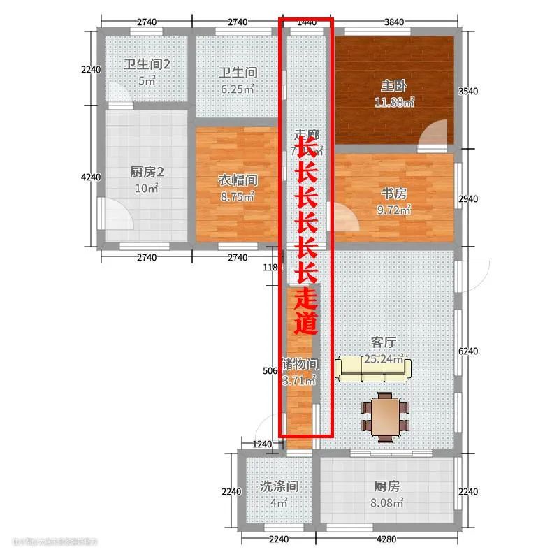 现在市场上的很多户型,都有一条长长的走道,像这样: