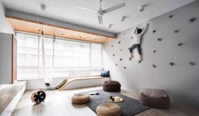 甚至有些“疯狂”的爸妈,将客厅拆的一干二净,为了宝宝也是拼了。四个柔软舒适的懒人椅,地毯,滑滑梯,秋千,攀岩墙......这个家真是想玩啥有啥。