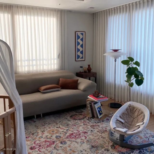 家中有茶几和沙发,占用了客厅大半个空间,活动空间大大减少。可以把茶几移除,留下沙发,摆上婴儿床啦,玩耍的地毯等等,沙发区域就变成宝宝玩耍的空间了。家长朋友可以坐在沙发上,看着宝宝在地毯上玩耍。