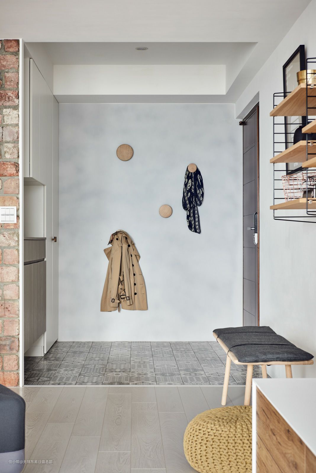 空间允许的话,用顶天立地的柜子作为隔断,不仅能分隔空间,也增加了收纳,进门的鞋子,衣服也不愁没地方放了。
