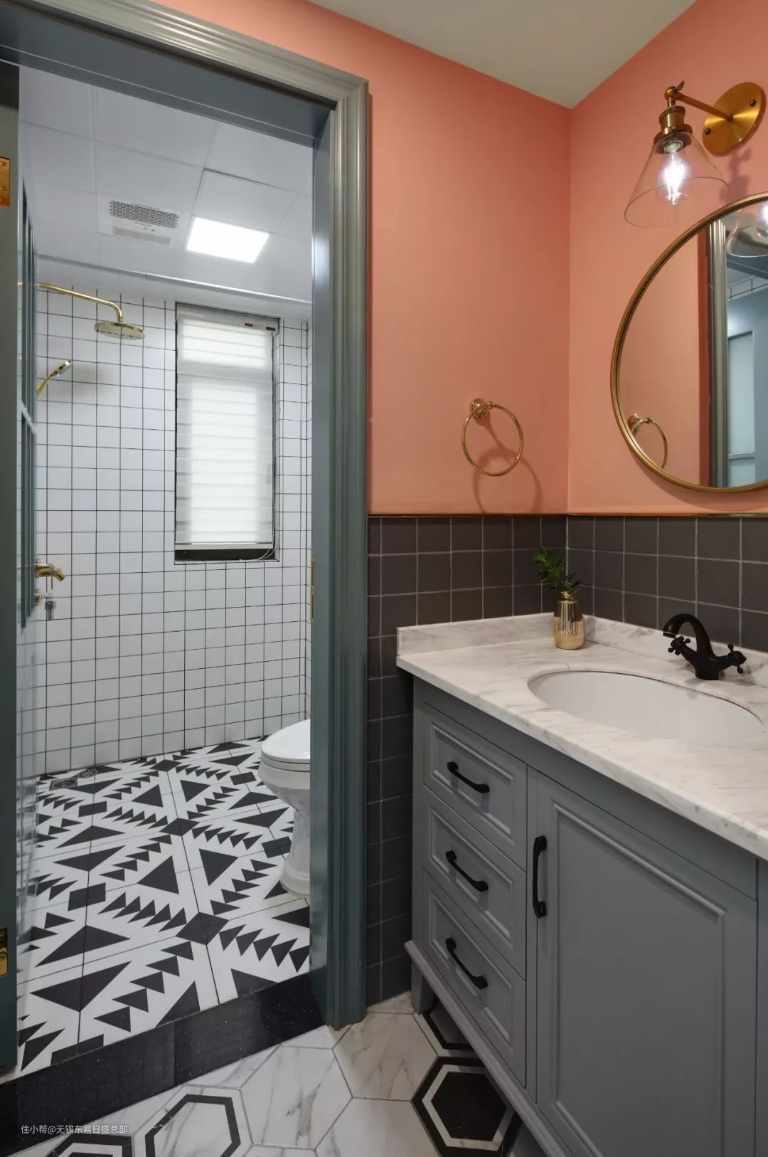 如果入门区域没有更多的空间来设计隔断,可以考虑将洗手台外移,减少日常进出卫生间的次数,而且洗手台外移,能起到一定的遮挡,视觉上起到一定的缓解作用。