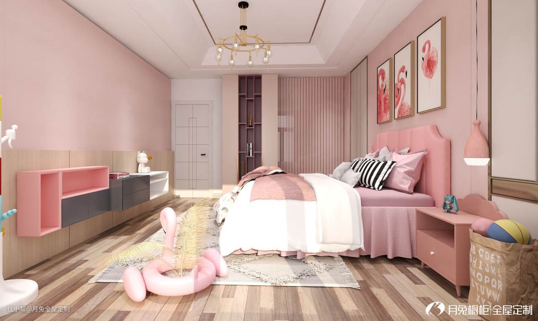 ▼粉色柜子搭配粉色床品,满满的少女心。