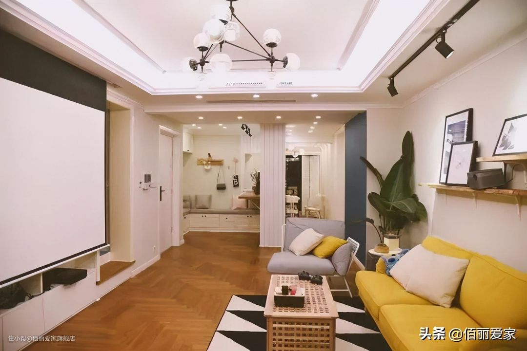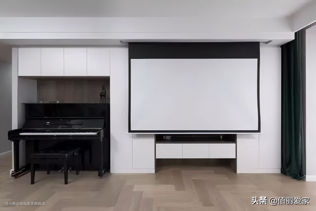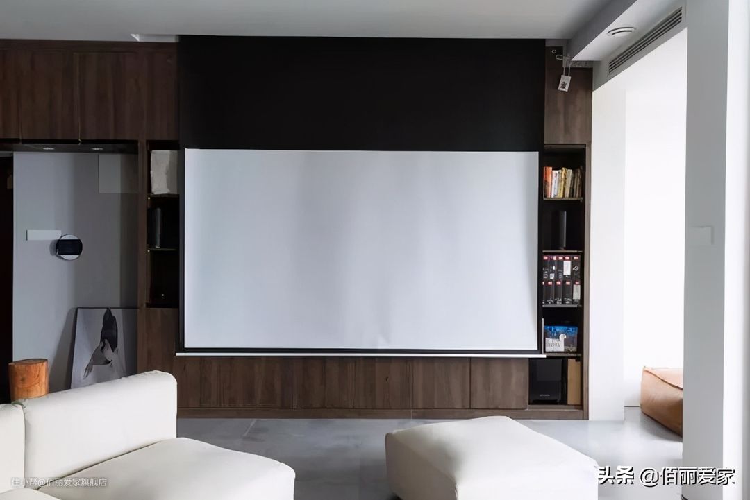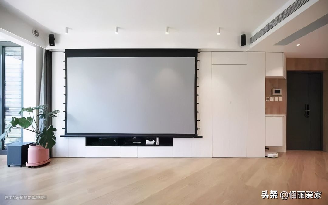 客厅不放电视,换成收纳柜+投影幕布,收纳不用愁,还很浪漫