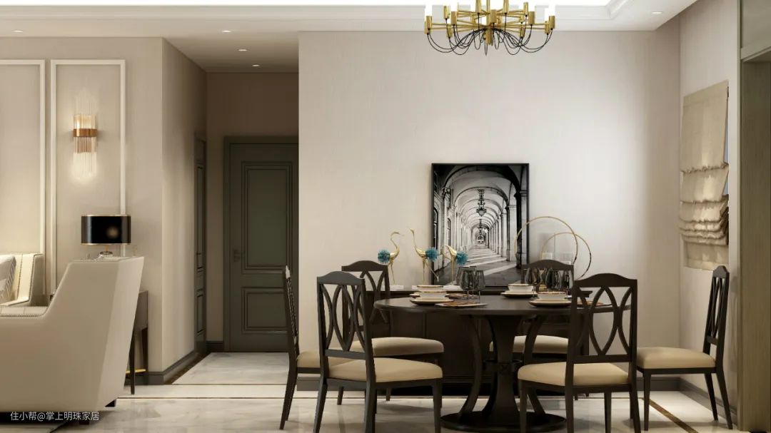 客餐厅一体,通用大理石地板,美式元素无处不在:沙发镶嵌铆钉、金属五金、石膏线条背景墙...堆叠出富丽装潢的层次感。