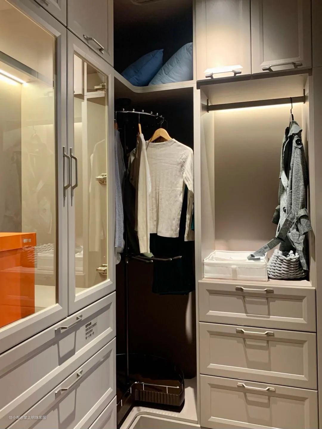 ▲主卧配齐步入式衣帽间和卫生间。L型布局衣帽间和三层旋转衣架最大化利用了空间,换装和拿取衣物都很方便。