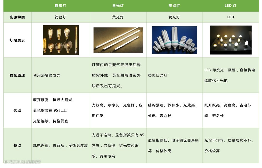 目前市面上常见的灯泡有白炽灯、日光灯、节能灯和LED灯,区别如下:
