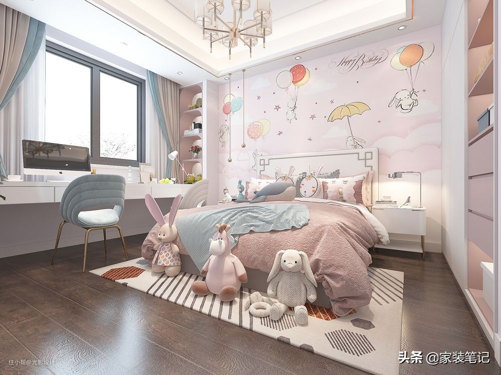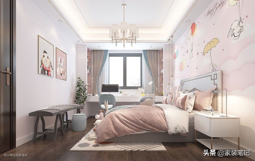 每个小女孩对粉色都是情有独钟,也许这种形容还不够恰当,对于女性来说,长大了应该也会喜欢这种粉粉嫩嫩的色彩吧,这种色彩能够体现出一个人的童心。女孩房整体采用粉色调,和主卧室一样,虽然没有飘窗,但是依然做了一个飘窗柜出来,非常的使用。床头做一大幅可爱的卡通壁画,在床尾摆放一台古筝,满足屋主女儿的兴趣需求。