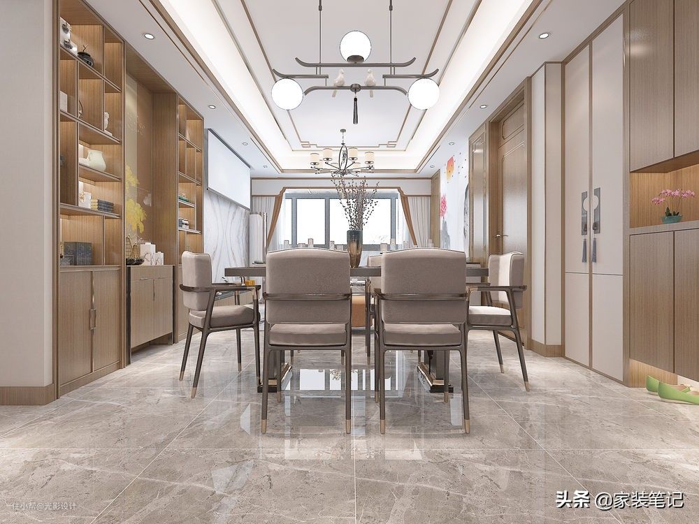 虽说房子面积有165个平方,只有三房的结构,但是入户就来到了餐厅空间,没有室内外的过渡区,也就是说没有玄关位置。由于餐厅挨入户门比较近,所以在餐厅的两边墙上,挨着入户的那边是做的鞋柜,另外一边则选择了做酒柜。精美又简洁的柜门,能够体现出现代中式的特色,中间的餐桌椅都选择的细脚,这样不会让空间显得压抑,会比较轻快一点。