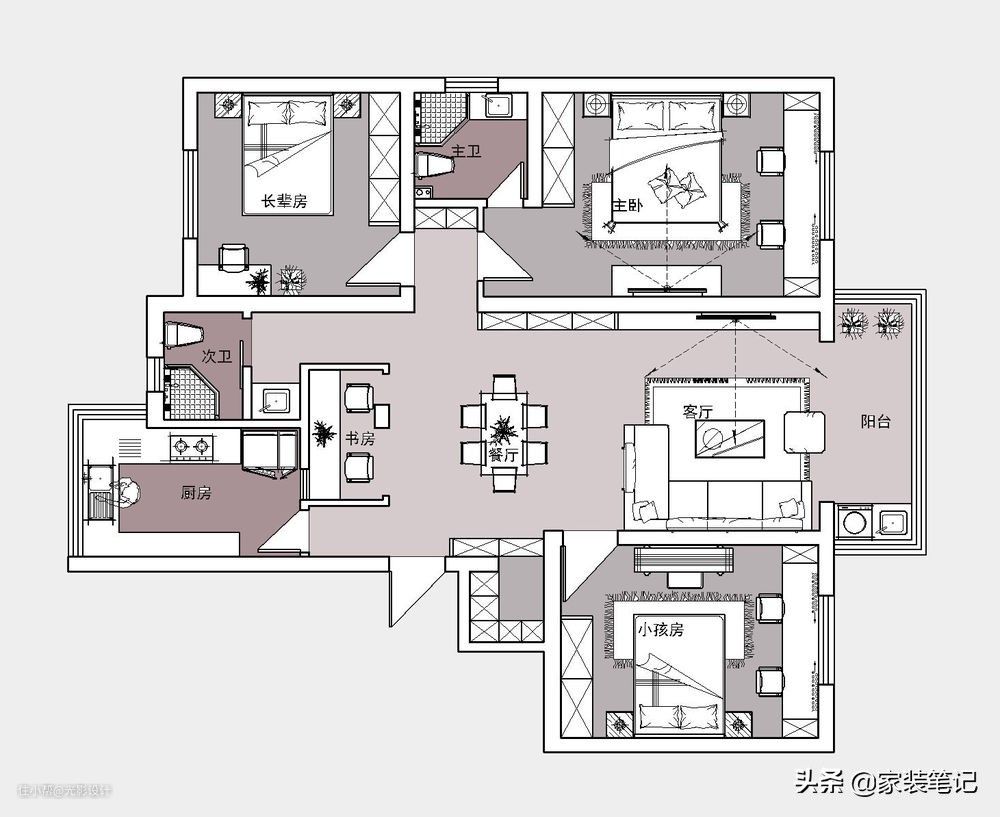 设计师通过和业主的商量之后,因为已经都水电完工了,所以在整理的平面结构上,就不必再去动他了,因为一旦要动的话,前面很多工作就白费了,不仅浪费造型,还很耽误时间。为了让利用率更高,在能做柜子的地方尽量都做满了柜子,因为柜子越多,住的年限就会越长,就像手机内存一样,常常会因为内存不够,而去换手机。