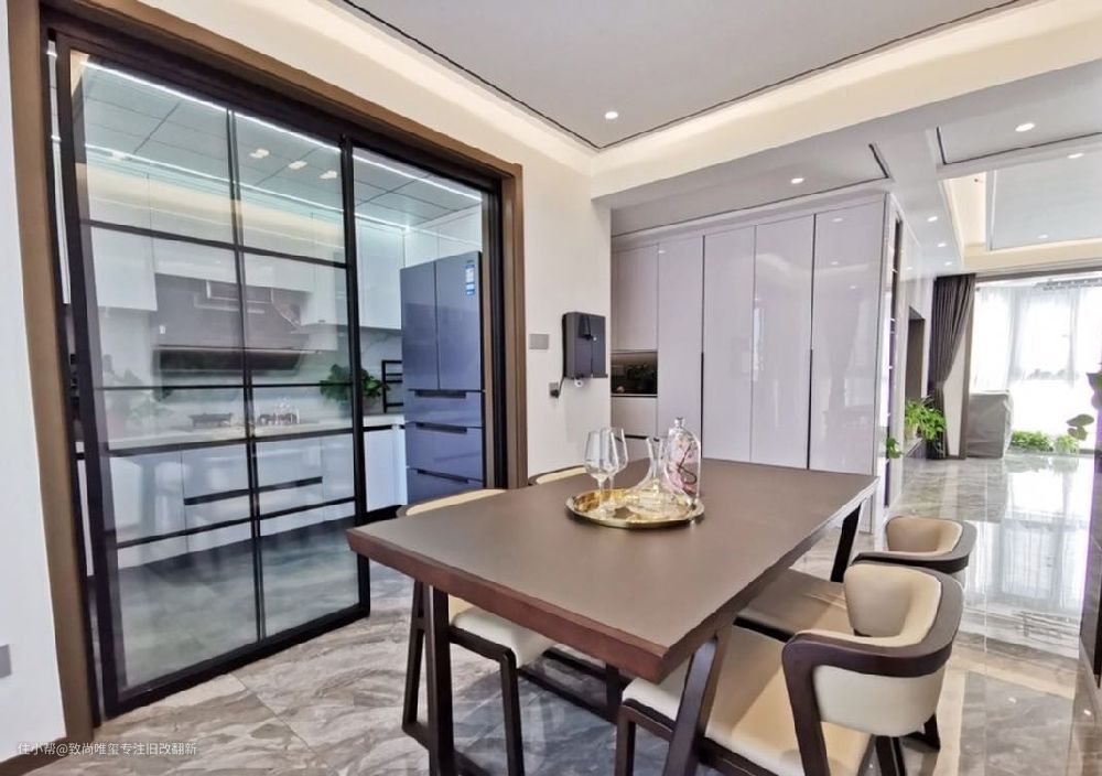 顶面设计无主灯造型吊顶,餐边柜与电视柜呼应,做了隔断酒柜收纳。全屋超高门设计,厨房门口设计了直饮机。生活用水更方便