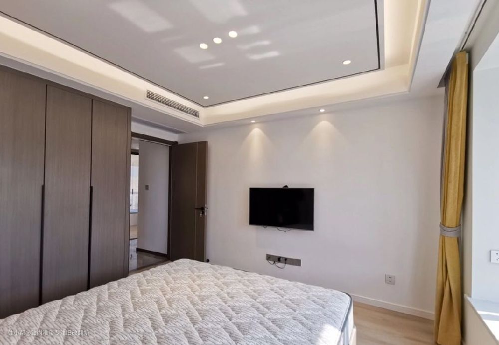 主卧吊顶与客餐厅一样,无主灯设计,床头射灯辅助光源。由于空间有限,摆放1米8的床之后两边距离小,所以采用的是抽拉式床头柜,平时可以把它隐藏在衣柜里。