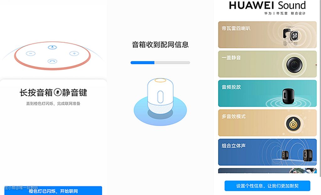 和绝大部分智能音箱一样,华为Sound智能音箱在首次使用前需要进行配网,也是实现音箱智能交互的前提条件,整体配网的过程并不复杂,在手机端下载“AI音箱”,打开app并靠近音箱,根据提示长按音箱的静音键,直到音箱的灯带呈橙色闪烁状态,按app内的提示逐步操作即可完成音箱的配网。