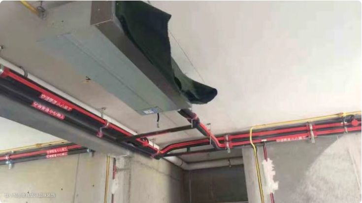 协商后,本着「小管让大管」的原则,应该最先安装中央空调(如果有新风的话,最先安装新风,一般的新风管道会比中央空调的粗),铺设气管、液管,预设好电源位置,然后水电管路再进行安装。