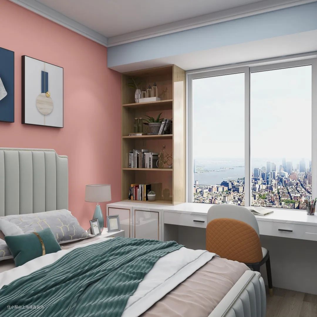 客户非常疼爱可爱的女儿,由于小公主喜欢蓝色,所以卧室选择以蓝色打底,设计师选用粉色作为跳色,来表现小女孩的俏皮与活力,清新的台灯,满眼望去皆是少女感。