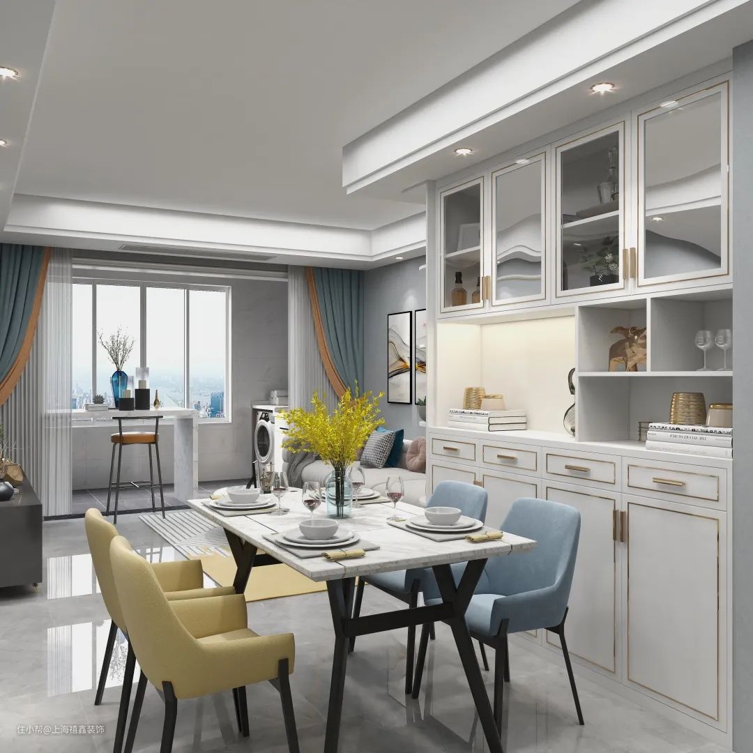 转角式好看又实用的极简风储物柜,二八原则,露两分藏八分不仅能展示一些摆件,同样能隐藏式储物,功能性极强,让餐厅看起来整洁干净没有凌乱感,用餐也多了一份优雅。