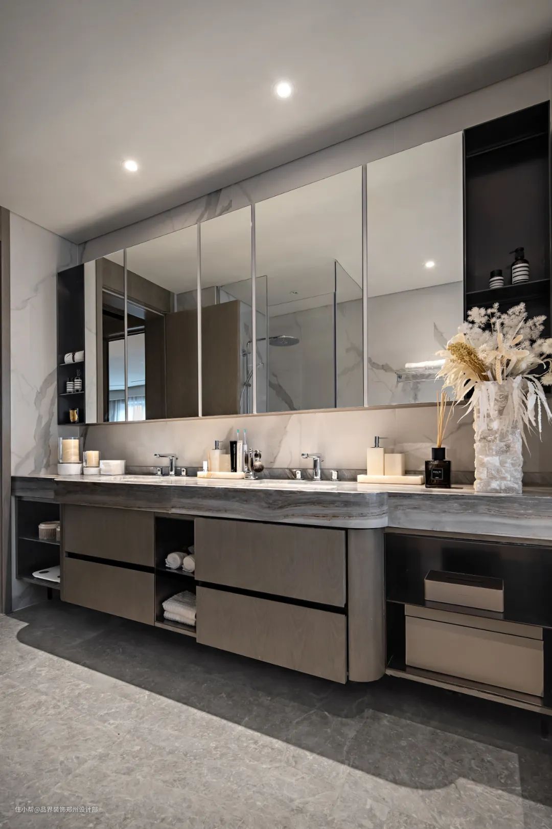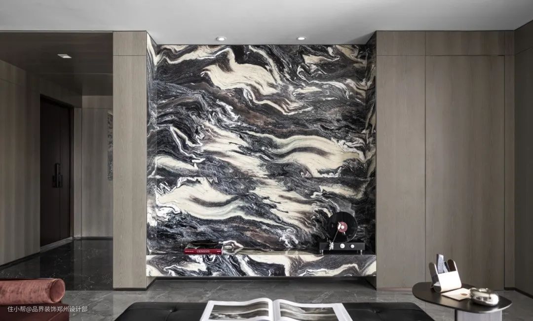 餐厅与客厅连通,桌面与墙体两种不同的天然石材,如同水墨的漫漶纹理为空间带来了活力的跃动,关注于居住者的情绪和兴致。
