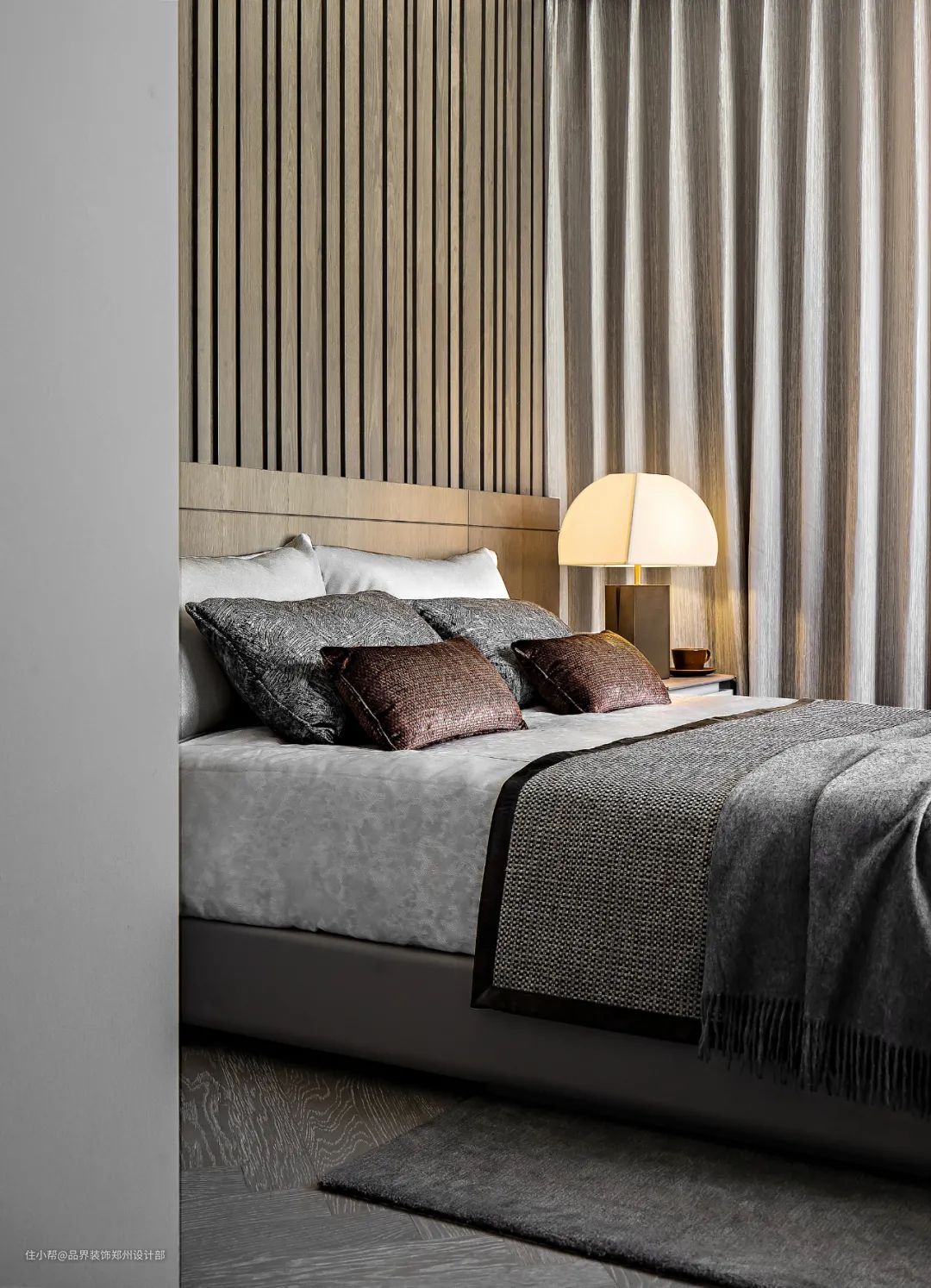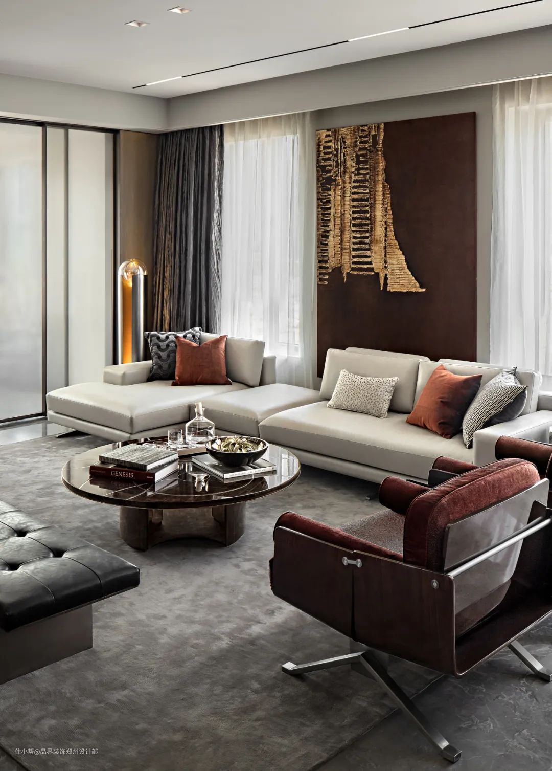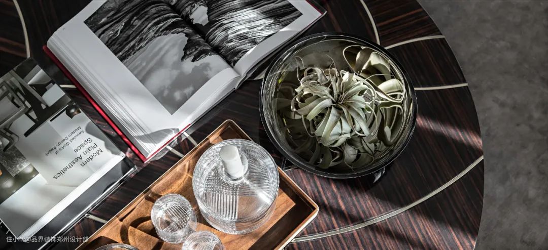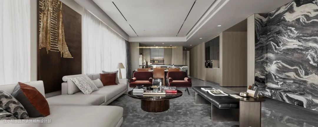 材质的表面纹理是低调的贵族怀旧质感与现代风格的融合,单品设计均卓越而经典,天鹅绒红单椅、灰色斑纹地毯、浅白色沙发......