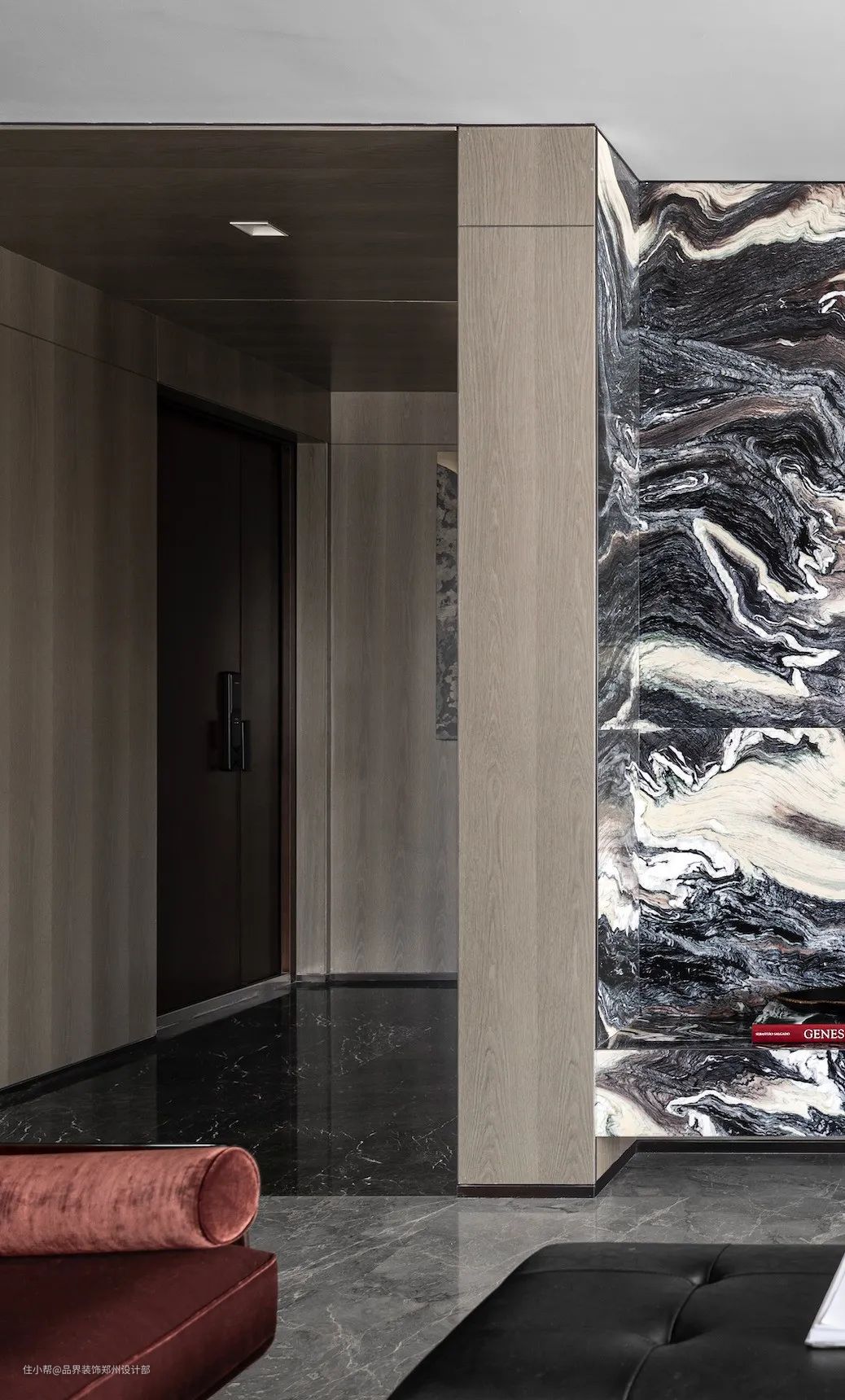 登堂入室,经过宽敞的玄关过廊转入客厅,木质墙面的柔和与石材的豪爽纹理构成一种空间戏剧。