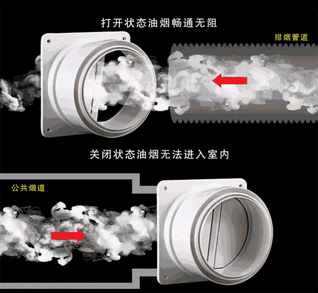 当油烟机启动后,瞬间将风流带动,此时就会推开止回阀内置的单向阀片,将油烟排入厨房的公共烟道里,保证厨房的空气正常;当油烟机停止后,止回阀内置的单向阀片在重力作用下就会自动关闭,此时公共烟道就是属于一个封闭的状态,那么自然就不会有油烟倒灌到厨房里来,让厨房空气保证正常状态。